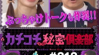 「カチコチ秘密倶楽部」今回秘密を打ち明けるお客様は…AV界から古川ほのか、明日葉みつは、金松季歩の3名。芸能界からはファイヤーサンダー こてつ、ちゃんぴおんず 日本一おもしろい大崎がご来店。元人気グラドルからAV界に転身した金松季歩が、グラドルイメージビデオの知られざる裏側を赤裸々告白。さらにフェザータッチに絶対の自信があるという大崎を発端に、芸人たちのフェザータッチ選手権が開幕! 女優陣に選ばれる最も気持ちいいフェザータッチは!?